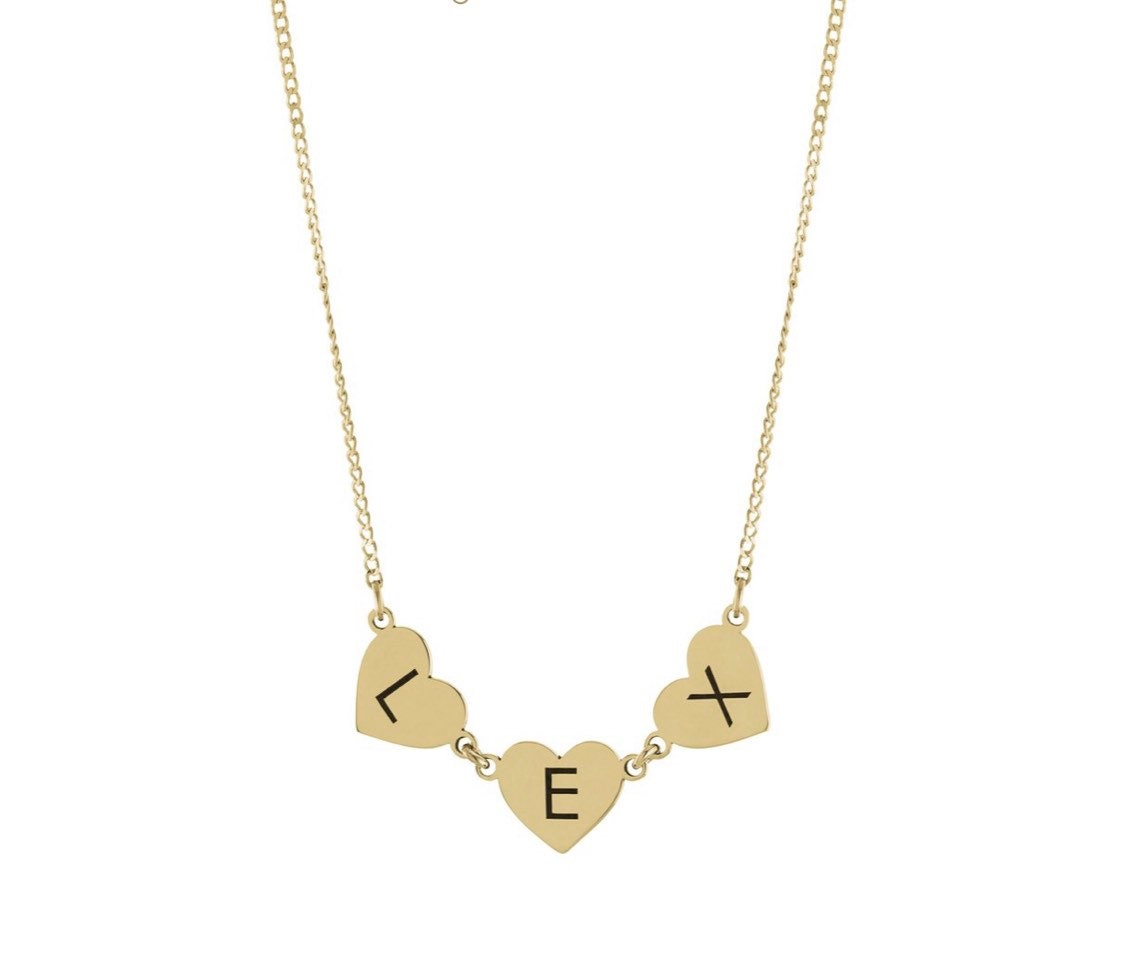 Hearts name necklace. Hearts letters / initials necklace. Sterling silver and 14K gold plated. Gold or silver.